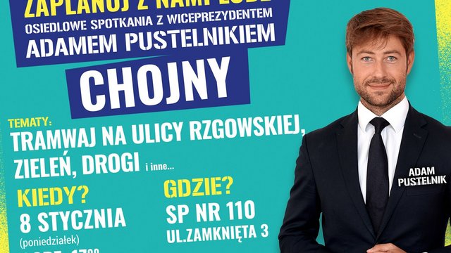 W nowym roku powraca cykl spotkań „Zaplanuj z nami Łódź!”. Omawiane są na nich najważniejsze sprawy łódzkich dzielnic. Pierwsze spotkanie w 2024 roku odbędzie się na osiedlu Chojny, w Szkole Podstawowej nr 110 przy ul. Zamkniętej 3. Start o godz. 17:00.