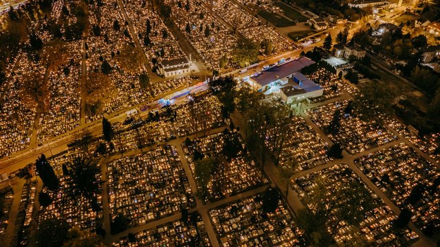 W okolicach Wszystkich Świętych tradycyjnie już na cmentarzach nie brakuje zniczy zapalanych przez bliskich osób, które od nas odeszły. Setki, a nawet tysiące światełek tworzą niesamowity klimat. Możecie go poczuć również dzięki naszym zdjęciom zarówno z lotu ptaka, jak i z ziemi.