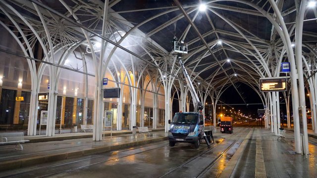 W nocy z 19 na 20 czerwca rozpoczęło się kompleksowe czyszczenie konstrukcji oraz mycie Przystanku Centrum. Pracownicy na podnośnikach najpierw będą czyścili rury podtrzymujące konstrukcję obiektu. Korzystają ze specjalistycznych detergentów, które są przeznaczone do mycia elementów stalowych.