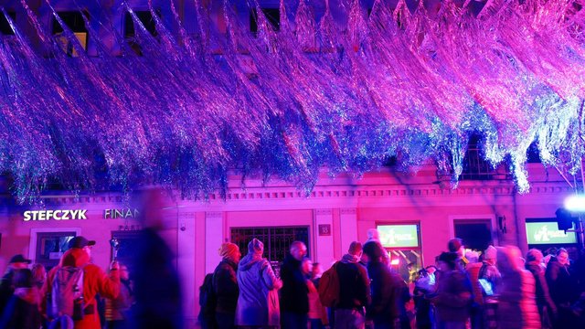 Spacerując Piotrkowską podczas Light Move Festival 2025 Łódź warto zadzierać głowę do góry! Po co? Na przykłąd po to, aby zobaczyć taflę srebrnych frędzli! Zobacz galerię!