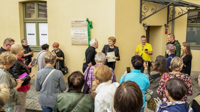 Na podwórku zrewitalizowanej przez Łódzką Spółkę Infrastrukturalną kamienicy przy ul. Zielonej 6 odsłonięto tablicę upamiętniającą jej słynnych mieszkańców.