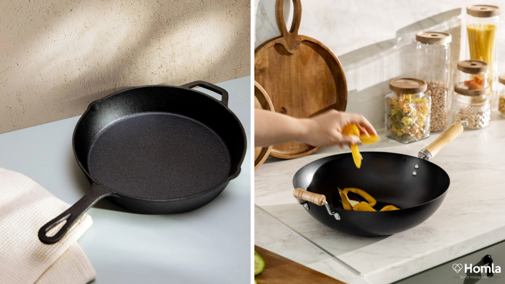 Patelnie z żeliwa są bardzo solidne i ciężkie. Ich zaletą jest to, że długo utrzymują ciepło. Najlepiej sprawdzą się do przygotowywania dań jednogarnkowych, potraw smażonych i pieczonych, zapiekanek czy do grillowania. Patelnie żeliwne należy czyścić ręcznie. Odpowiednia pielęgnacja zapewni trwałość na wiele lat.