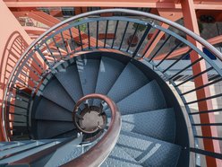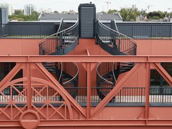 Elewacja Słonecznych Tarasów została cofnięta względem pierzei, tworząc przestronny plac przed wejściem, z ażurową, stalową konstrukcją, która pełni funkcję zarówno estetyczną, jak i praktyczną – chroni przed hałasem z ulicy.
