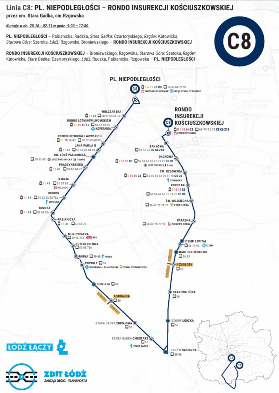 RONDO INSUREKCJI KOŚCIUSZKOWSKIEJ – Broniewskiego, Rzgowska, Starowa Góra: Szeroka, Rzgów: Katowicka, Stara Gadka: Czartoryskiego, Łódź: Rudzka, Pabianicka, pl. Niepodległości, Rzgowska – PL. NIEPODLEGŁOŚCI