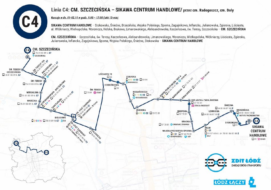 SIKAWA – Stokowska, Śnieżna, Brzezińska, Wojska Polskiego, Sporna, Zagajnikowa, Inflancka, Julianowska, Zgierska, Liściasta, al. Włókniarzy, Lutomierska, Wielkopolska, Woronicza, Helska, Brukowa, Limanowskiego, Aleksandrowska, Kaczeńcowa, św. Teresy od Dzieciątka Jezus, Szczecińska – CM. SZCZECIŃSKA